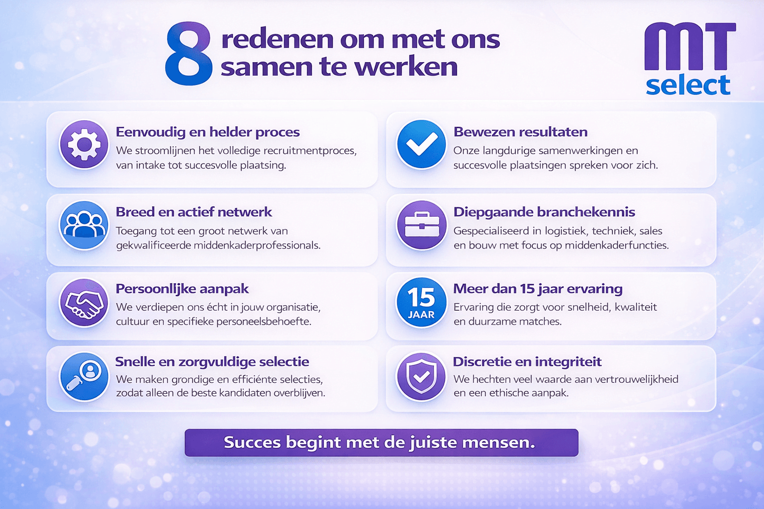 MTselect werft en selecteert vakspecialisten en middenkaderprofessionals voor mkb-bedrijven. Wij helpen bij functies waar inhoudelijke vakkennis en ervaring essentieel zijn en waar een verkeerde keuze echt pijn doet.